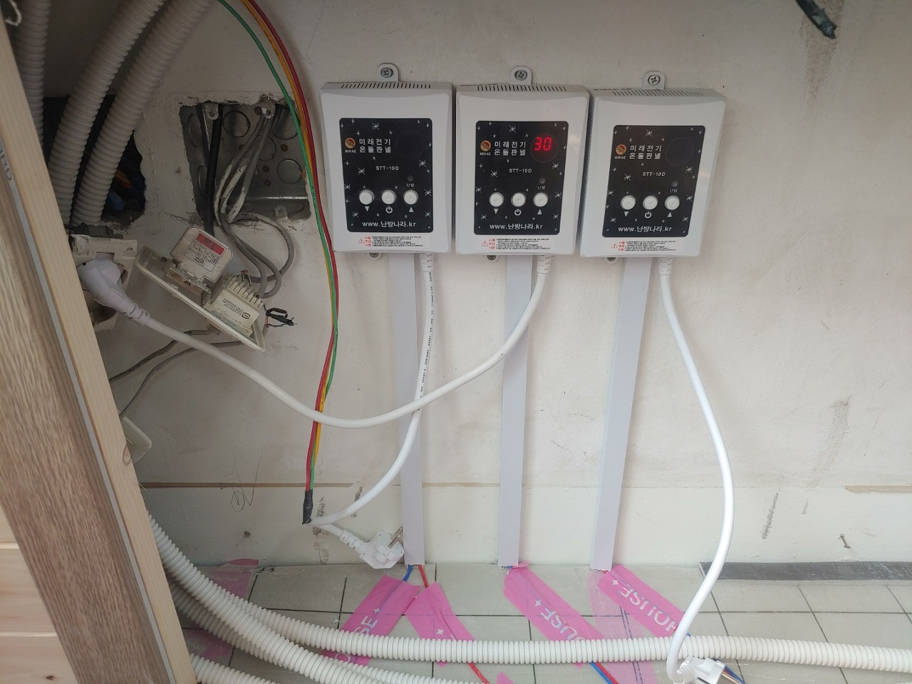 배치된 난방필름과 온도조절기를 연결한 다음 테스트를 해봅니다.